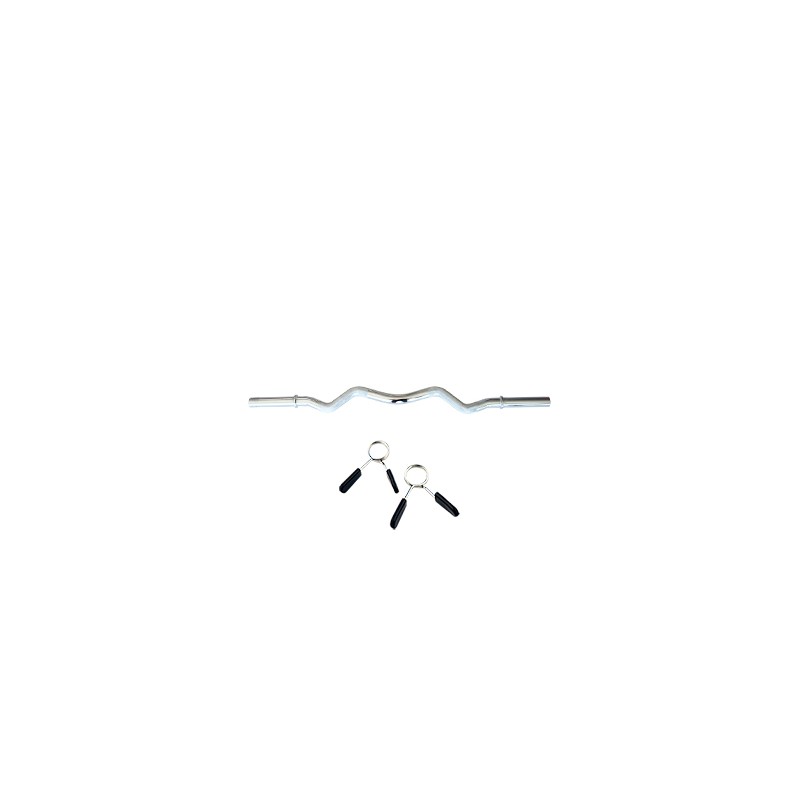 Barra de dominadas cromada en forma de Z que coloca las muñecas en una posición más natural al entrenar bíceps o tríceps. Se suministra con un kit de bloqueo de muelle. Peso: 7 kg. Longitud: 120 cm. Diámetro: 30 mm