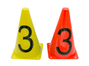 Conos semirrígidos de 23cm de altura con diseño en vinilo (números, signos matemáticos…). Perfectos para la realización de circuitos o actividades de aprendizaje.