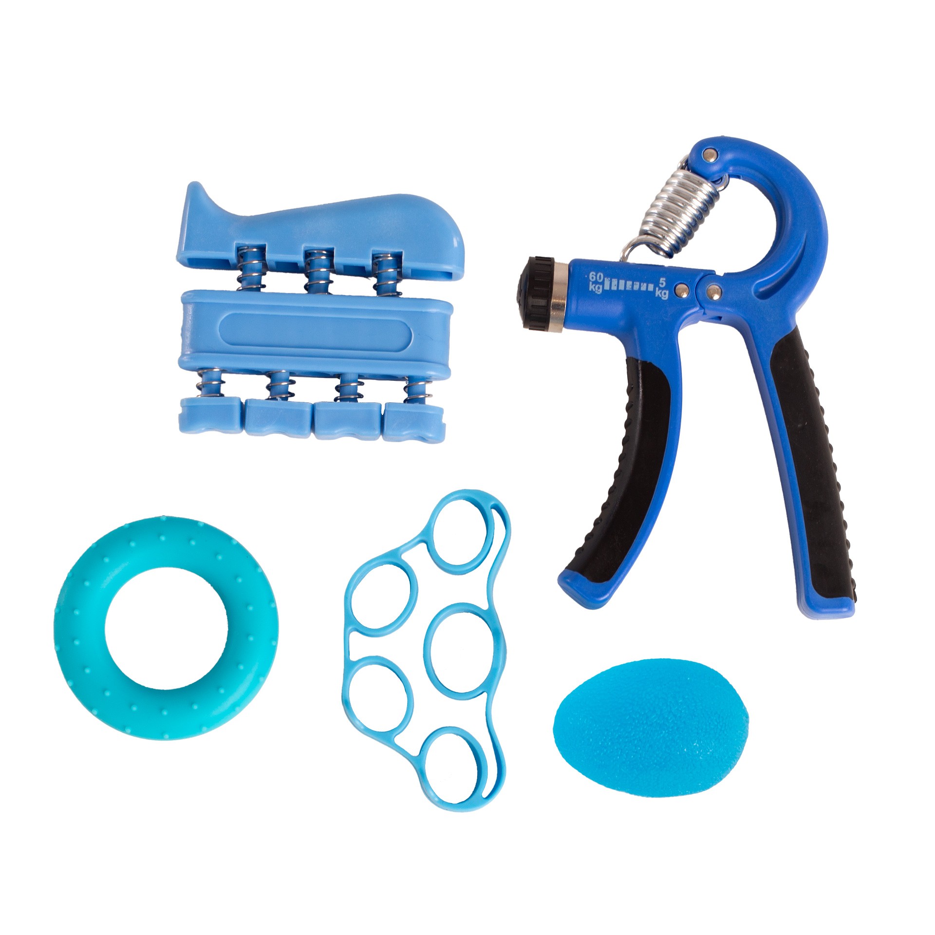 Incluye una empuñadura de agarre ajustable (5-60kg), un ejercitador de dedos, un anillo de agarre, una bola antiestrés y ejercitador de dedos con banda elástica.